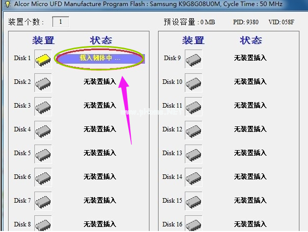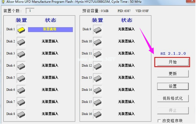 5、運(yùn)行對(duì)應(yīng)的量產(chǎn)工具,插入要修復(fù)的U盤到電腦上,等待程序檢測(cè)到該U盤后,就可以進(jìn)行相關(guān)操作啦。鼠標(biāo)點(diǎn)擊“開始”按鈕執(zhí)行量產(chǎn)過(guò)程。