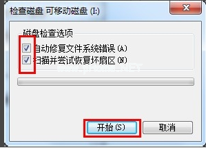 3、最后鼠標(biāo)點(diǎn)擊“開始”按鈕來(lái)檢查并修復(fù)磁盤錯(cuò)誤。修復(fù)完成后,就可以嘗試打開U盤啦。