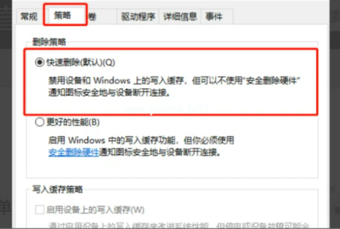 4、在彈出的USB屬性界面,點(diǎn)擊菜單欄下的“Policy”選項(xiàng),將USB設(shè)置為“快速刪除”,最后點(diǎn)擊“OK”。