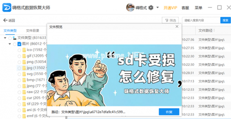 3、掃描完成后,在左側(cè)可以根據(jù)文件類型等篩選數(shù)據(jù),在右側(cè)雙擊就可以預(yù)覽數(shù)據(jù)。