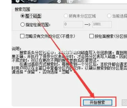 2:在搜索已丟失分區(qū)窗口中,勾選整個(gè)磁盤(pán),點(diǎn)擊“開(kāi)始搜索”,待搜索完成再返回打開(kāi)U盤(pán)就可以了。