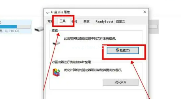 2:在U盤(pán)屬性窗口中,點(diǎn)擊“工具”下的“檢查”選項(xiàng);
