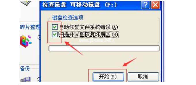 第四、勾選【自動(dòng)修復(fù)文件系統(tǒng)錯(cuò)誤】【掃描并嘗試修復(fù)壞扇區(qū)】,點(diǎn)擊【開(kāi)始】。