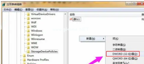 4、選中“torageDevicePolicies項(xiàng),在右邊新建的“Dword值”將其命名為“WriteProtect”。