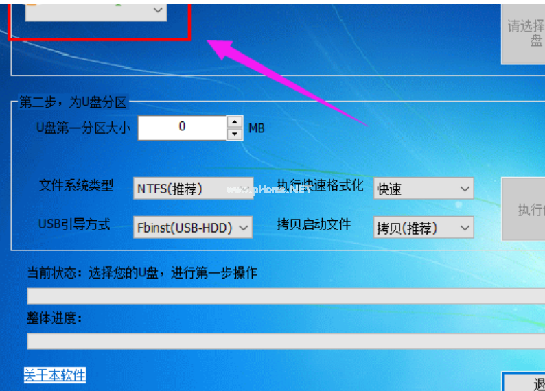 2、在U盤一欄中選擇要進行分區(qū)的U盤。