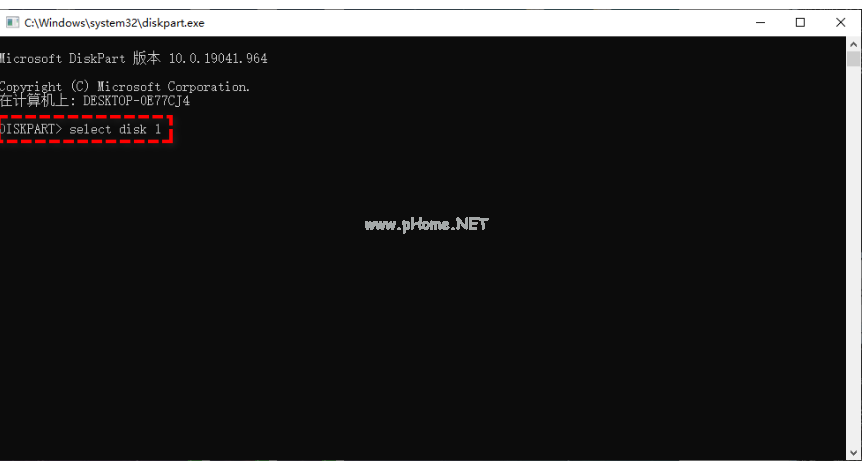 3、再輸入“select disk 1”后按“回車”。(本機硬盤為0,在沒有其他硬盤的情況下,U盤為硬盤1,如果不確定,可以輸入“l(fā)ist disk”查看盤符。)