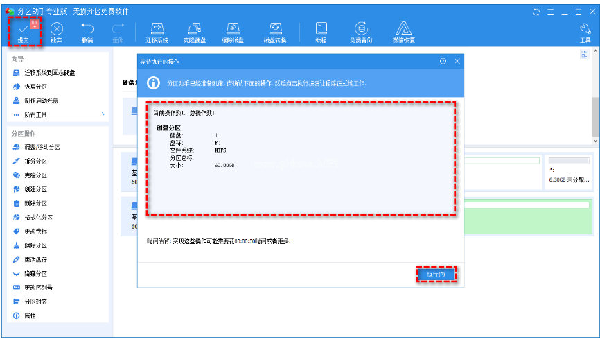 4、點擊左上角的“提交”查看將要進行的操作,確認無誤后點擊“執(zhí)行”等待完成即可。