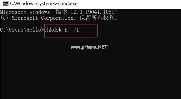 2、然后在窗口中輸入”chkdsk 盤符: /f“。例如,小編輸入的是”chkdsk H: /f“。要注意,冒號的后面要有一個空格。