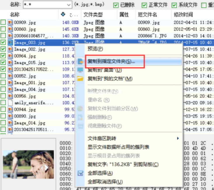 5、將掃描出來的文件復(fù)制到其他的盤,完成U盤數(shù)據(jù)恢 復(fù)過程。在軟件中勾選需要的文件,然后點(diǎn)擊鼠標(biāo)右鍵并選擇"復(fù)制到指定文件夾"。