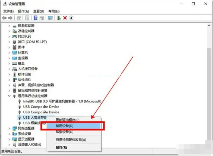 3、通用串行總線控制器下面有個“USB大容量存儲設(shè)備”,點擊“禁用設(shè)備”即可恢復(fù)。
