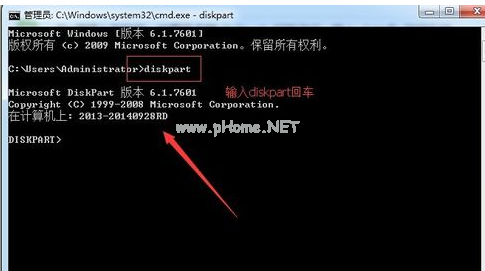 2.在打開的窗口中輸入“diskpart”,按回車鍵執(zhí)行。