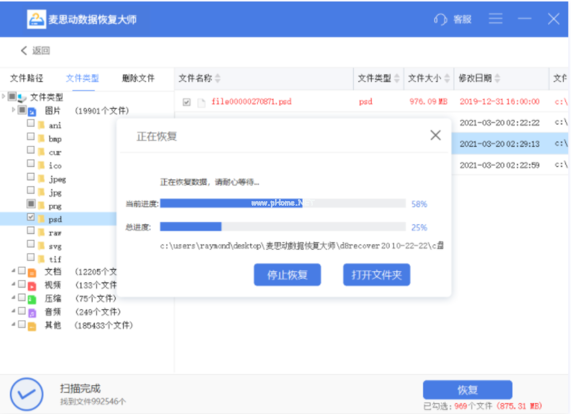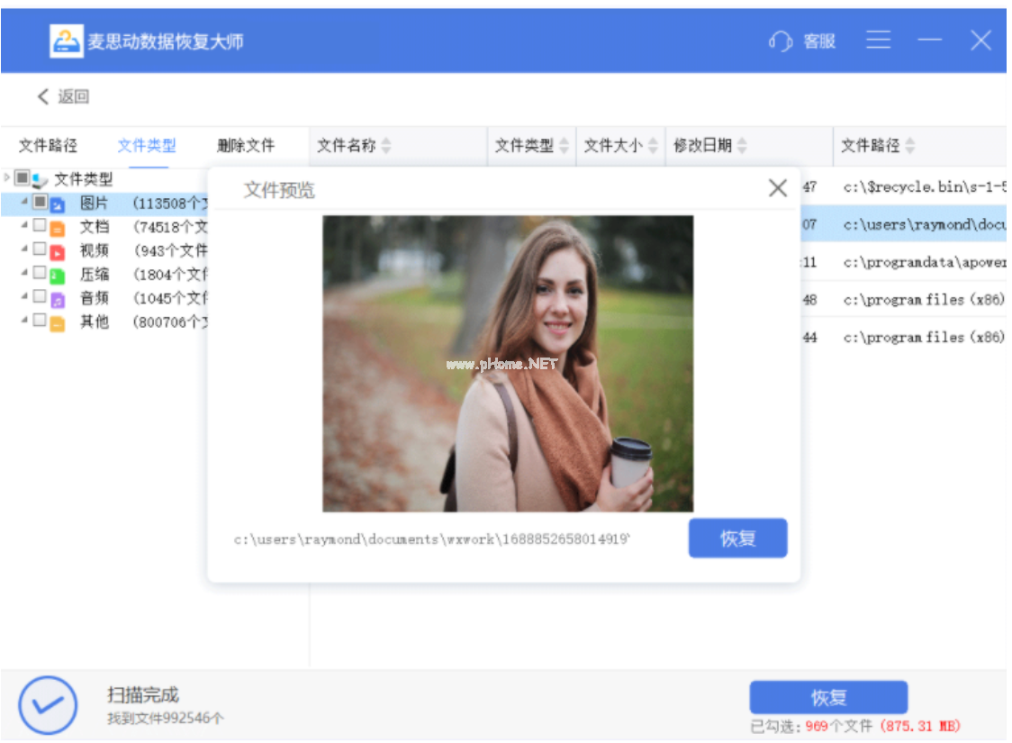 4、此時軟件會自動掃描,掃描完成后會出現(xiàn)可以恢復的文件列表,勾選需要恢復的文件,點擊恢復即可。