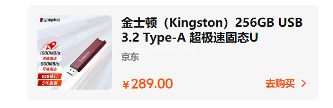 2、金士頓256GB 固態(tài)U盤讀取速度1000MB/s,寫入速度900MB/s,性能方面遠(yuǎn)超一些國(guó)產(chǎn) 固態(tài)U盤。金士頓256GB