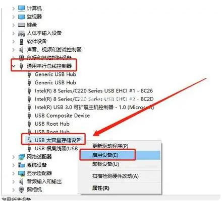 2、然后在設(shè)備管理器界面,鼠標右鍵【USB大容量存儲設(shè)備】,選擇【啟用設(shè)備】即可。