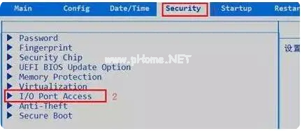 1、一般來說,重啟電腦不斷按下BIOS快捷鍵就可以進入BIOS界面。進入BIOS界面后,使用方向鍵切換至“Security”選項卡,選擇“I/O Port Access”并回車。