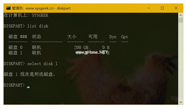 4、使用 select 命令選中你的 U 盤,在我們的演示環(huán)境中 U 盤是磁盤 1,所以使用 select disk 1 命令將它選中: