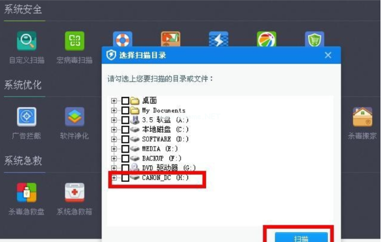 6、點擊自定義掃描按鍵,進(jìn)到到自定義掃描界面。