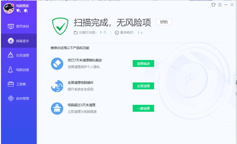 5、等待掃描結(jié)果,如果有病毒,會出現(xiàn)查殺病毒的選項,相應(yīng)選擇查殺就好了,如果沒有,會告知U盤掃描結(jié)果無風(fēng)險項。