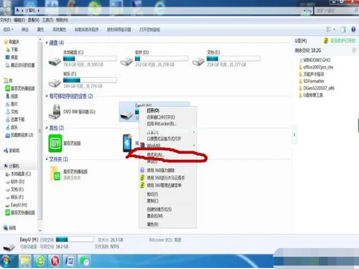 3、具體的格式化操作步驟,在U盤的磁盤盤符上,點(diǎn)擊鼠標(biāo)右鍵,在打開的頁面里,找到【格式化】選項(xiàng),然后點(diǎn)擊鼠標(biāo)左鍵,即可打開【格式化】的頁面。