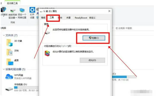 步驟3:在U盤屬性窗口界面中,點(diǎn)擊上面的“工具”,再選擇點(diǎn)擊“檢查”按鈕;