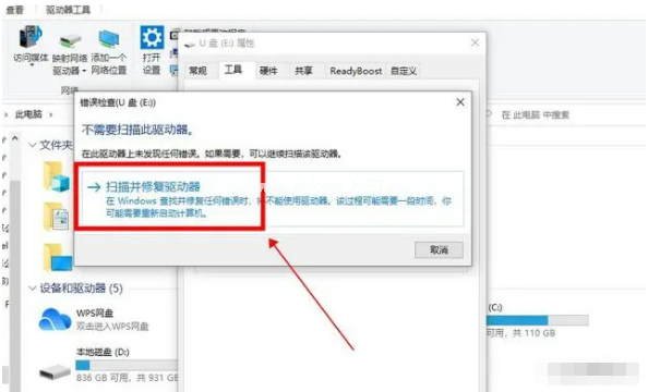 步驟4:這時會彈出U盤錯誤檢查窗口界面,點(diǎn)擊“掃描并修復(fù)驅(qū)動器”,耐心等待掃描恢復(fù)即可。