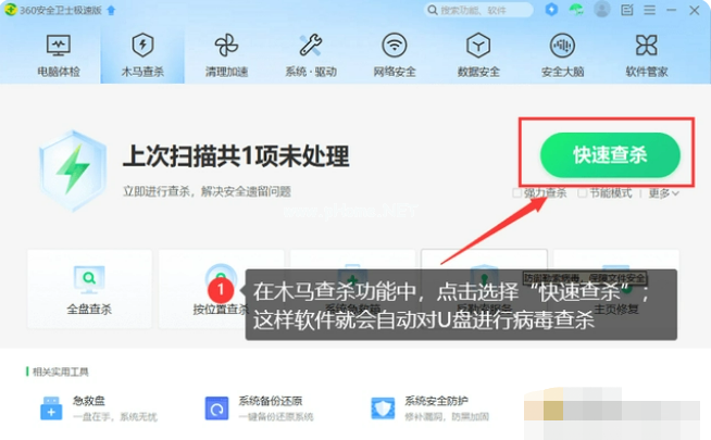 2、選擇【快速查殺】,讓該軟件對電腦進行病毒查殺。