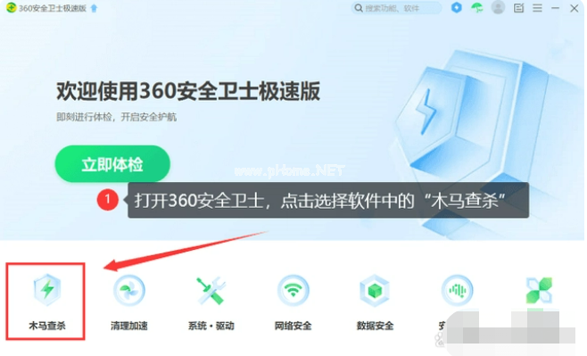 1、首先打開軟件360安全衛(wèi)士,找到并點擊【木馬查殺】。
