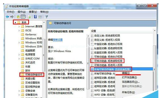 2、然后依次點(diǎn)擊“計算機(jī)配置——管理模塊——系統(tǒng)——可移動存儲訪問”,在右側(cè)中找到“可移動磁盤:拒絕讀取權(quán)限”和“所有可移動磁盤:拒絕讀取權(quán)限”單擊右鍵點(diǎn)擊“編輯”選項, 接著在彈出的窗口界面中點(diǎn)擊“已禁用”單選按鈕,在點(diǎn)擊“應(yīng)用——確定”按鈕。