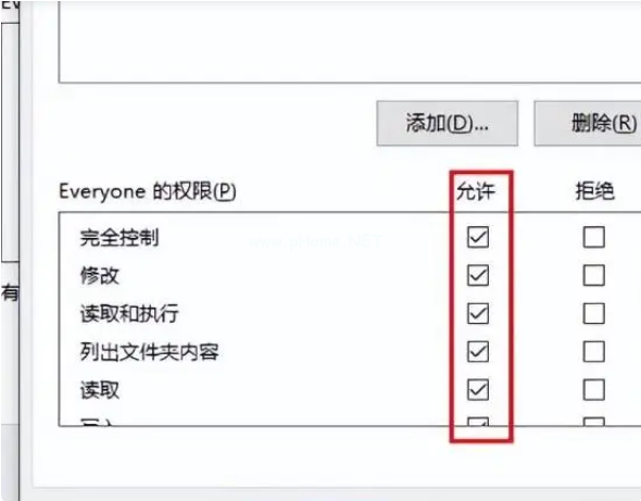 3、在打開(kāi)的窗口中,我們選中Everyone,勾選everyone的權(quán)限中的完全控制,依次確定即可。