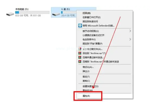 1、在U盤盤符上鼠標(biāo)右鍵,在彈出的菜單中點(diǎn)擊選擇“屬性”;