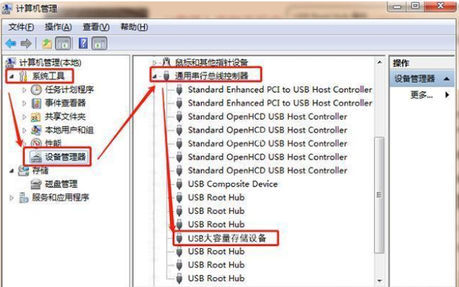 1、u盤(pán)檢測(cè)不到怎么辦呢?我們首先打開(kāi)桌面上的【計(jì)算機(jī)】,接著鼠標(biāo)右擊選擇【管理】,在管理窗口界面中,選擇【系統(tǒng)工具】中的【設(shè)備管理】,最后在右邊頁(yè)面點(diǎn)擊【通用串行總線控制器】,找到【USB大容量存儲(chǔ)設(shè)備】并鼠標(biāo)雙擊打開(kāi)。