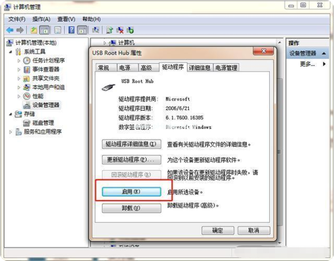 1、如果上述方法不行的話(huà),那么我們可以重啟USB設(shè)備。方法一中打開(kāi)【USB大容量存儲(chǔ)設(shè)備】,選擇【驅(qū)動(dòng)程序】,這里驅(qū)動(dòng)可能被禁用了,選擇【啟用】再將U盤(pán)插上去看看是否被讀取了。