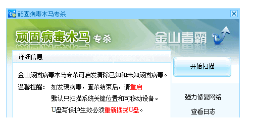 金山出品的專門針對U盤以及移動硬盤內(nèi)存卡類的病毒木馬專殺工具,先下載金山頑固專殺,主要針對上面的那些殺毒軟件無法殺死或者找出的病毒類型,所以它的適應性稍微窄一點,但它能解決其他軟件不能修復解決的問題,所以算是一個補充的U盤殺毒軟件。