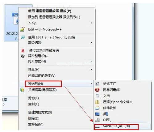 3、在電腦上找到要下載(復(fù)制)到U盤的視頻文件,對著這個文件點擊鼠標(biāo)右鍵,選擇“發(fā)送到”→“可移動磁盤”,即可將該視頻文件下載(復(fù)制)到U盤的根目錄。