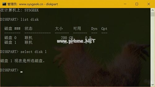 4、使用 select 命令選中U 盤,在演示環(huán)境中 U 盤是磁盤 1,所以使用 select disk 1 命令將它選中。注意:不論 Linux 還是 Windows 系統(tǒng),硬件都是從 0 開始標(biāo)識(shí)的,所以千萬別選錯(cuò)了。