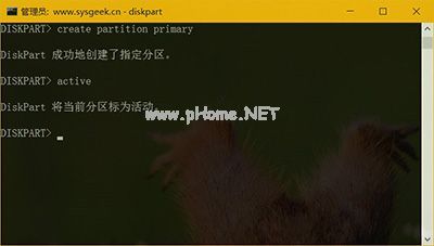 6、使用如下命令創(chuàng)建一個(gè)新的主分區(qū)并標(biāo)記不活動(dòng)分區(qū):create partition primary和active,之所以標(biāo)記為活動(dòng)分區(qū),是為了方便將 Windows 系統(tǒng) ISO 映像放上去當(dāng)啟用 U 盤來用。