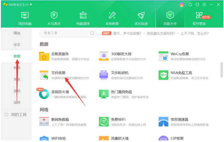 2、然后點(diǎn)擊左側(cè)的“數(shù)據(jù)”,選擇其中的“文件恢復(fù)”點(diǎn)擊添加,就可以下載安裝好360u盤數(shù)據(jù)恢復(fù)工具。