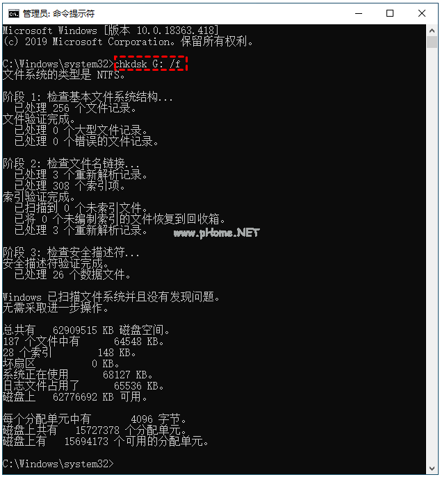 2、依次輸入以下命令:輸入chkdsk G: /f并按回車。(字母G為U盤的驅(qū)動(dòng)器號(hào),根據(jù)具體情況修改。)此命令可以修復(fù)損壞或無法召喚的U盤。
