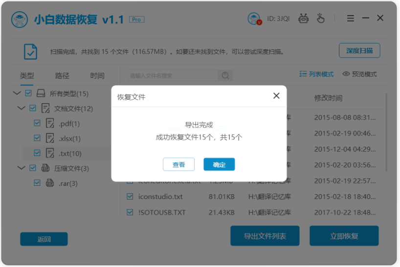 4、經(jīng)過一段時(shí)間之后就能把選擇的全部文件恢復(fù)完畢了,點(diǎn)擊確定即可。