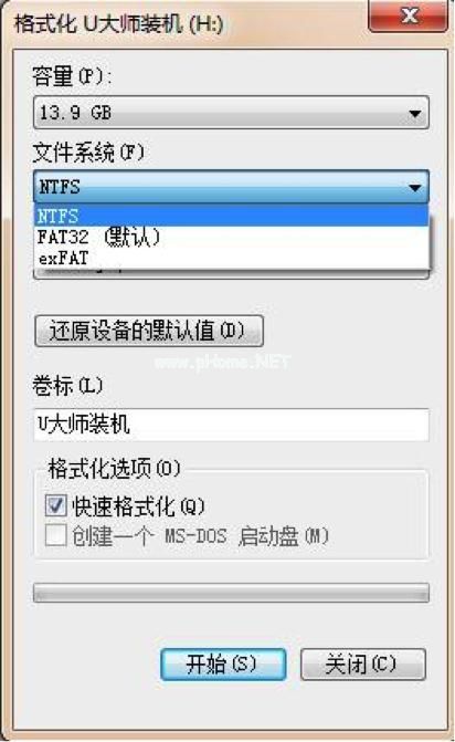 3、在彈出來的格式化可移動磁盤對話框中,把文件系統(tǒng)中選擇NTFS,這里默認是FAT32,然后單擊開始。