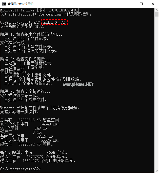2. 依次輸入以下命令。輸入chkdsk G: /f并按回車。(字母G為U盤的驅(qū)動器號,根據(jù)具體情況修改。)此命令可以修復損壞或無法召喚的U盤。