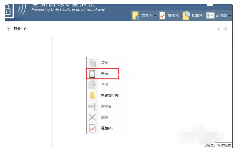 3、然后把需要加密的文件或者文件夾粘貼進去,在右上角找到并點擊選項,在彈出的窗口中點擊模式切換,輸入登陸密碼,切換回普通模式,這時候你會發(fā)現(xiàn)無法對加密的文件進行任何操作了。
