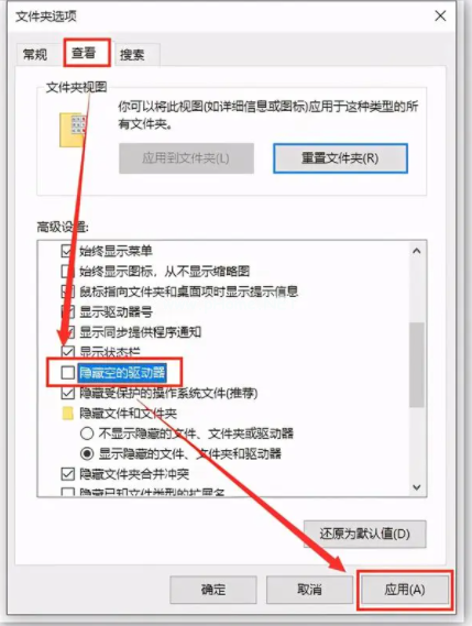 2、打開(kāi)文件夾選項(xiàng)界面后,點(diǎn)擊切換查看選項(xiàng)卡,取消勾選“隱藏空的驅(qū)動(dòng)器”,點(diǎn)擊“應(yīng)用”即可。