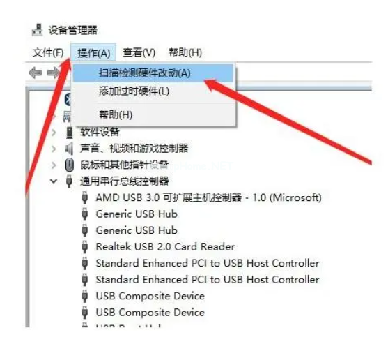 6、再點(diǎn)擊“操作”-“掃描檢測(cè)硬件改動(dòng)”;
