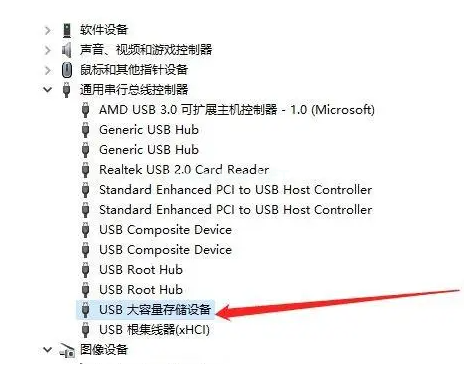 3、在設(shè)備管理器窗口中,點(diǎn)擊展開(kāi)“通用串行總控制器”,選擇“USB大容量存儲(chǔ)設(shè)備”;