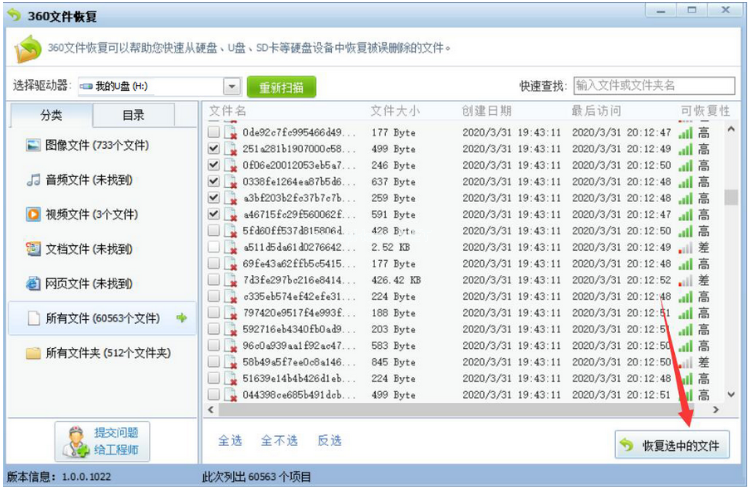 4、掃描完成后,選擇我們需要恢復(fù)的文件,點(diǎn)擊“恢復(fù)選中的文件”。