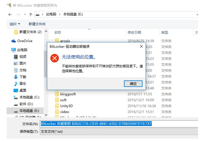 4、注意,不能把恢復(fù)密鑰保存在非移動驅(qū)動器的根目錄下,也不能保存在已加密的移動磁盤中。