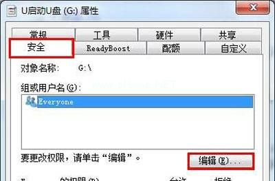 2、打開U盤的“屬性”后,選擇“安全”選項卡,點擊“編輯”按鈕,如下圖所示: