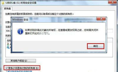 4、勾選“替換子容器和對象的所有者”,之后就會出現(xiàn)提示窗口,無需其他操作,單擊“確定”即可,然后再單擊“應用、確定”按鈕,如下圖所示: