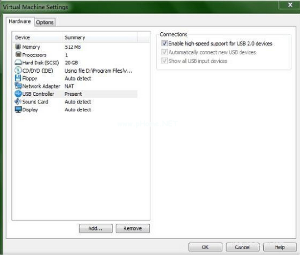 1、首先運(yùn)行虛擬機(jī),然后依次查看“工具欄” – “VM” – “Settings” – “Hardware”,檢查下“Device”欄目中有沒有“USB Controller”,要是沒有ADD的話那么添加 一個(gè)。如果有,那么我們繼續(xù)點(diǎn)擊它,然后查看右邊是否全部都勾選了,如下圖所示: